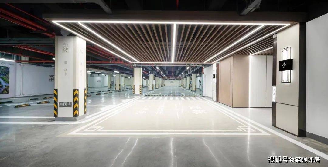 比如说负一楼车库入户大堂,都贴上了瓷砖,还做了入户射灯,非常有心。甚至在每一栋门前,都贴心的做了人行道标识;此外还做了明显的灯光和标记,让业主归家或者友人到访时,能快速找到对应的楼栋。