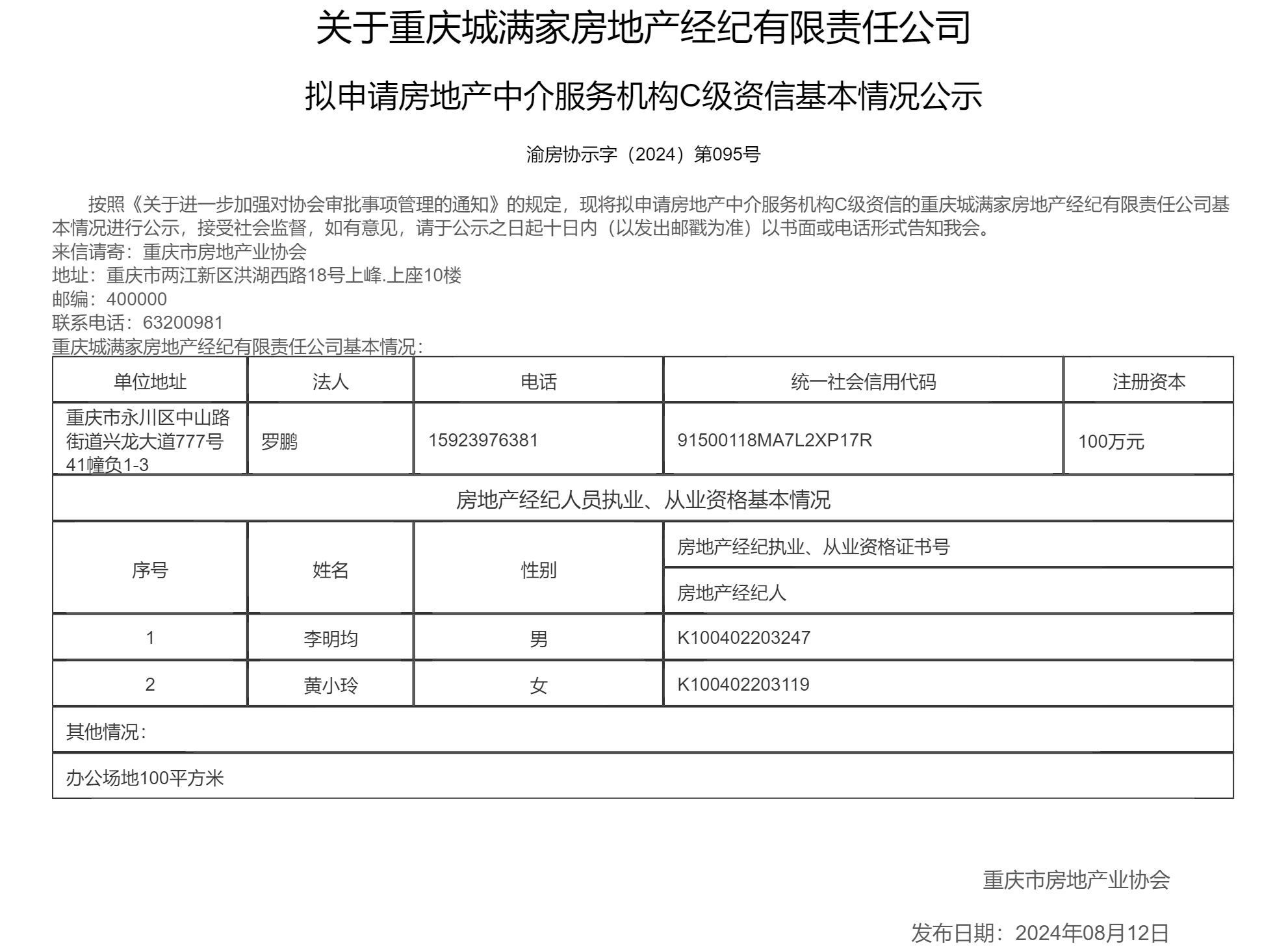 首 页 新闻动态 楼盘展示 市场动态 房地产经纪 专题 蔡家智慧新城 保交楼保交房 "两久"项目2025 自媒体自律联盟 名企及优质楼盘联展 休闲地产 美好家园 美好天赋 复工复产 "两久"项目2024 "白名单"项目融资 通知 资专委/商专委 登记/测绘投诉 协会专区 “金九银十”如期而至,9月重庆中心城区新建商品住房成交环比增长超3成 涉及保交房、租房、“人房地钱”……住建部副部长董建国重磅阐释 “中秋团圆·爱在我家”品质楼盘促销活动圆满结束 中秋品质楼盘促销活动持续火爆 线下展会仅剩最后一天! 您的当前位置 : 主页 > 房地产经纪 > 关于重庆城满家房地产经纪有限责任公司拟申请房地产中介服务机构C级资信基本情况公示 2024-08-19 14:30 来源:全媒体中心 返回 友情链接 重庆市政府部门网站 重庆网上房地产