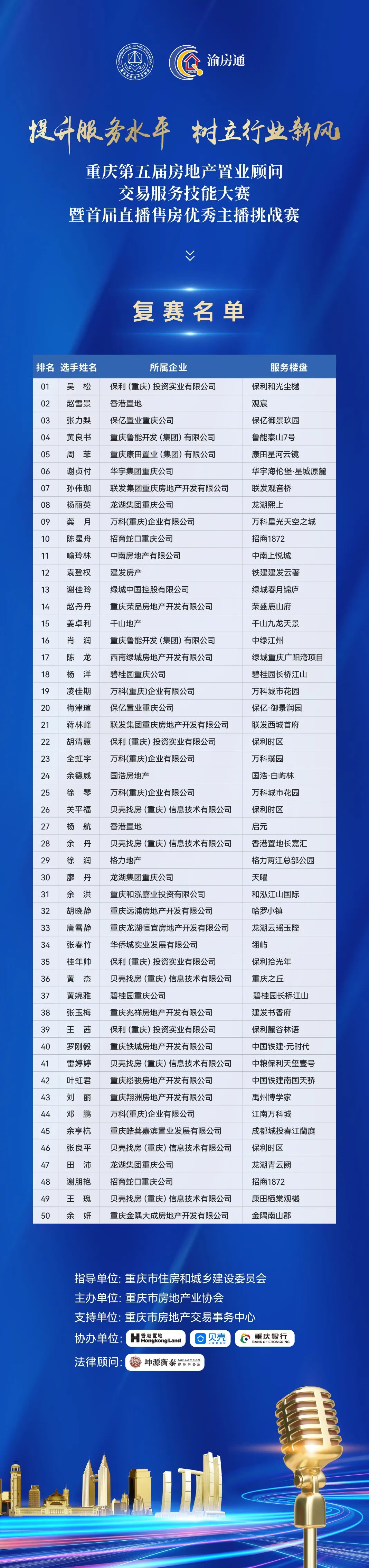 50个复赛名额吸引了近300多名置业顾问竞争。最终,来自保利的吴松、香港置地的赵雪景、保亿的张力梨、鲁能的黄良书、康田的周菲、华宇的谢贞付、联发的孙伟珈、龙湖的杨丽英、万科的龚月、招商的陈星舟等50人赢得复赛“门票”。