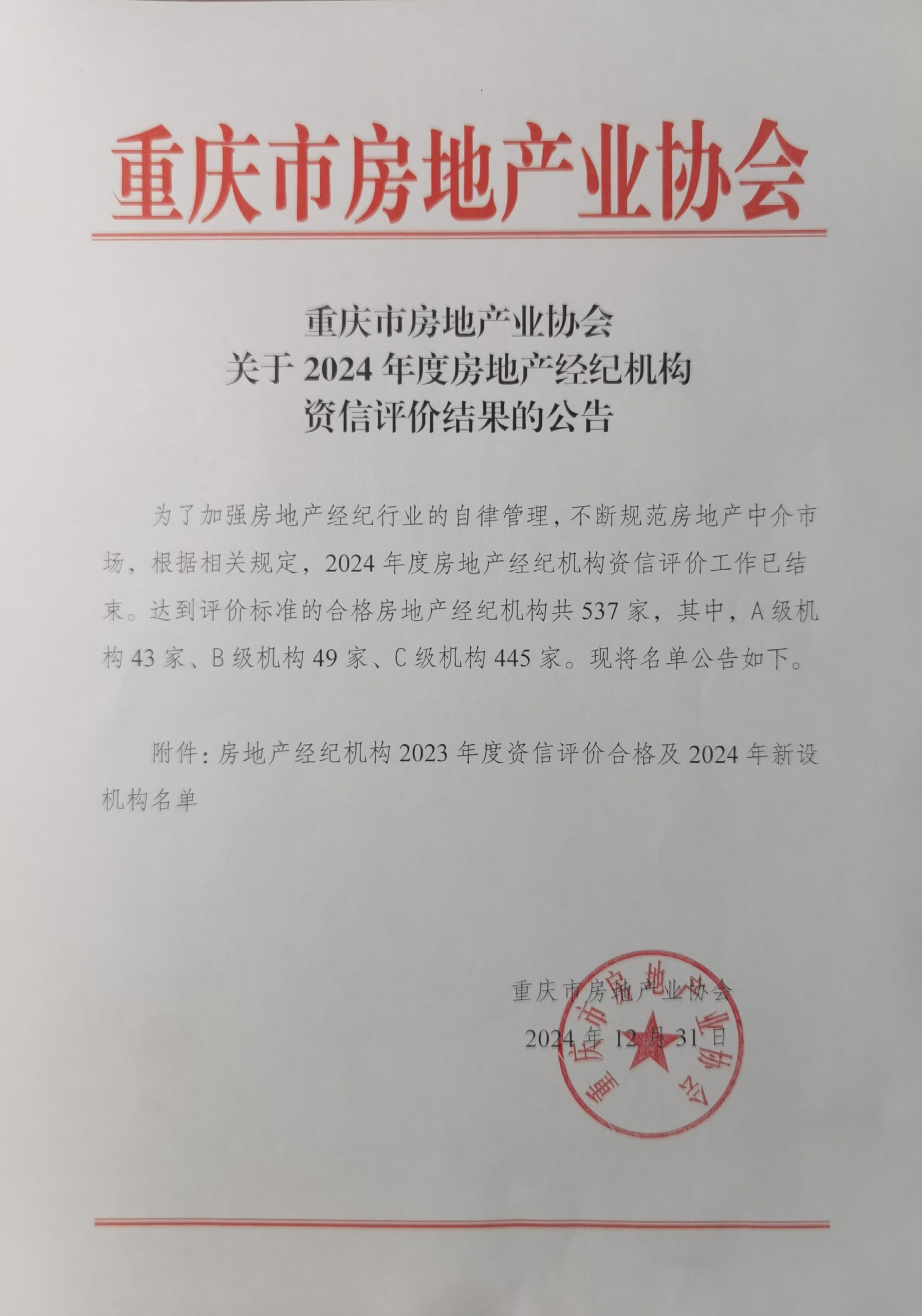 首 页 新闻动态 楼盘展示 市场动态 房地产经纪 专题 蔡家智慧新城 保交楼保交房 "两久"项目2025 自媒体自律联盟 名企及优质楼盘联展 休闲地产 美好家园 美好天赋 复工复产 "两久"项目2024 "白名单"项目融资 通知 资专委/商专委 登记/测绘投诉 协会专区 “金九银十”如期而至,9月重庆中心城区新建商品住房成交环比增长超3成 涉及保交房、租房、“人房地钱”……住建部副部长董建国重磅阐释 “中秋团圆·爱在我家”品质楼盘促销活动圆满结束 中秋品质楼盘促销活动持续火爆 线下展会仅剩最后一天! 您的当前位置 : 主页 > 房地产经纪 > 市房协关于2024年度房地产经纪机构资信评价结果的公告 2025-01-13 22:57 来源:全媒体中心 附件:2023年度资信评价合格及2024年新设机构名单 返回 友情链接 重庆市政府部门网站 重庆网上房地产