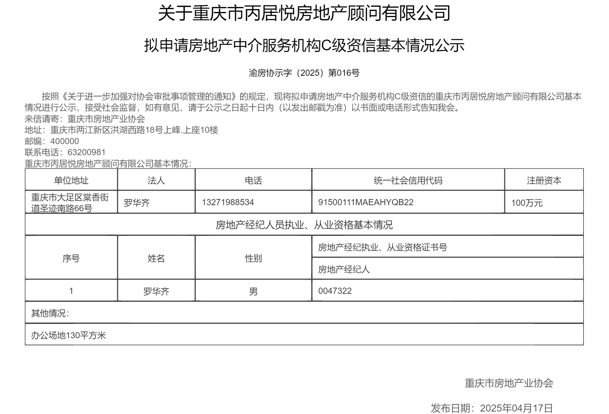 首 页 新闻动态 楼盘展示 市场动态 房地产经纪 专题 蔡家智慧新城 保交楼保交房 "两久"项目2025 自媒体自律联盟 名企及优质楼盘联展 休闲地产 美好家园 美好天赋 复工复产 "两久"项目2024 "白名单"项目融资 通知 资专委/商专委 登记/测绘投诉 协会专区 “金九银十”如期而至,9月重庆中心城区新建商品住房成交环比增长超3成 涉及保交房、租房、“人房地钱”……住建部副部长董建国重磅阐释 “中秋团圆·爱在我家”品质楼盘促销活动圆满结束 中秋品质楼盘促销活动持续火爆 线下展会仅剩最后一天! 您的当前位置 : 主页 > 房地产经纪 > 关于重庆市丙居悦房地产顾问有限公司 拟申请房地产中介服务机构C级资信基本情况公示 2025-04-18 10:26 来源:全媒体中心 返回 友情链接 重庆市政府部门网站 重庆网上房地产