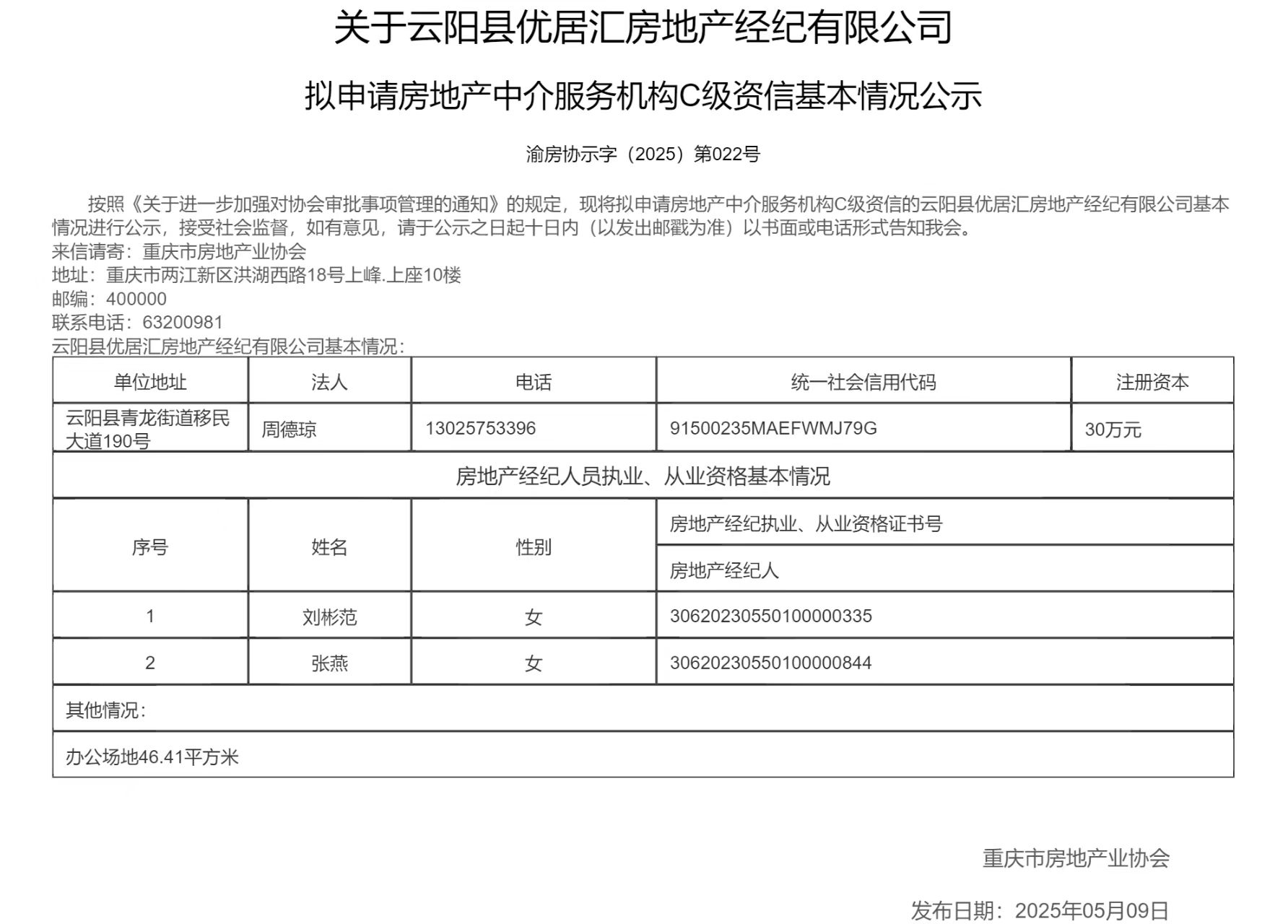 首 页 新闻动态 楼盘展示 市场动态 房地产经纪 专题 蔡家智慧新城 保交楼保交房 "两久"项目2025 自媒体自律联盟 名企及优质楼盘联展 休闲地产 美好家园 美好天赋 复工复产 "两久"项目2024 "白名单"项目融资 通知 资专委/商专委 登记/测绘投诉 协会专区 “金九银十”如期而至,9月重庆中心城区新建商品住房成交环比增长超3成 涉及保交房、租房、“人房地钱”……住建部副部长董建国重磅阐释 “中秋团圆·爱在我家”品质楼盘促销活动圆满结束 中秋品质楼盘促销活动持续火爆 线下展会仅剩最后一天! 您的当前位置 : 主页 > 房地产经纪 > 关于云阳县优居汇房地产经纪有限公司 拟申请房地产中介服务机构C级资信基本情况公示 2025-05-15 10:17 来源:全媒体中心 返回 友情链接 重庆市政府部门网站 重庆网上房地产