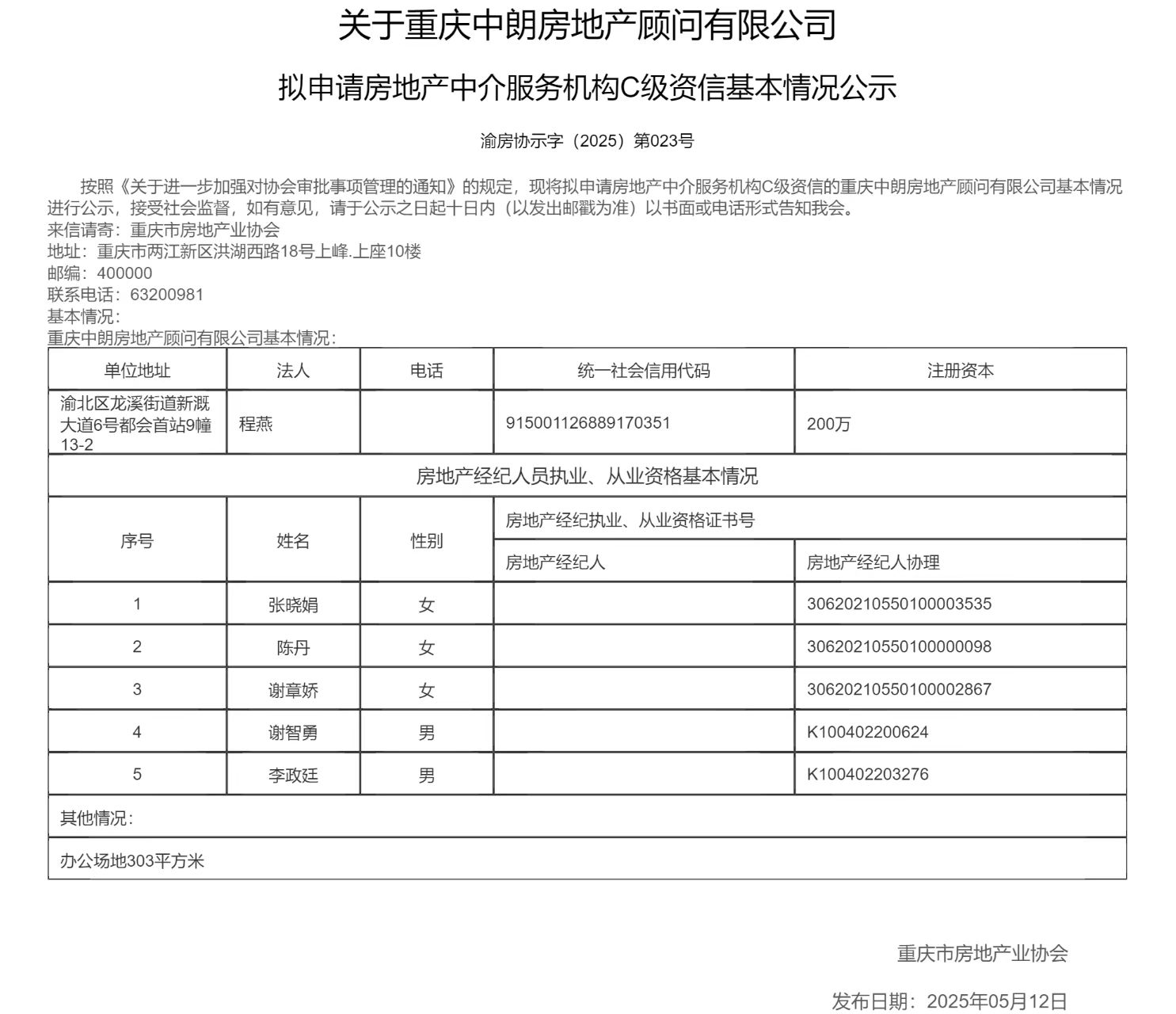 首 页 新闻动态 楼盘展示 市场动态 房地产经纪 专题 蔡家智慧新城 保交楼保交房 "两久"项目2025 自媒体自律联盟 名企及优质楼盘联展 休闲地产 美好家园 美好天赋 复工复产 "两久"项目2024 "白名单"项目融资 通知 资专委/商专委 登记/测绘投诉 协会专区 “金九银十”如期而至,9月重庆中心城区新建商品住房成交环比增长超3成 涉及保交房、租房、“人房地钱”……住建部副部长董建国重磅阐释 “中秋团圆·爱在我家”品质楼盘促销活动圆满结束 中秋品质楼盘促销活动持续火爆 线下展会仅剩最后一天! 您的当前位置 : 主页 > 房地产经纪 > 关于重庆中朗房地产顾问有限公司 拟申请房地产中介服务机构C级资信基本情况公示 2025-05-15 10:18 来源:全媒体中心 返回 友情链接 重庆市政府部门网站 重庆网上房地产