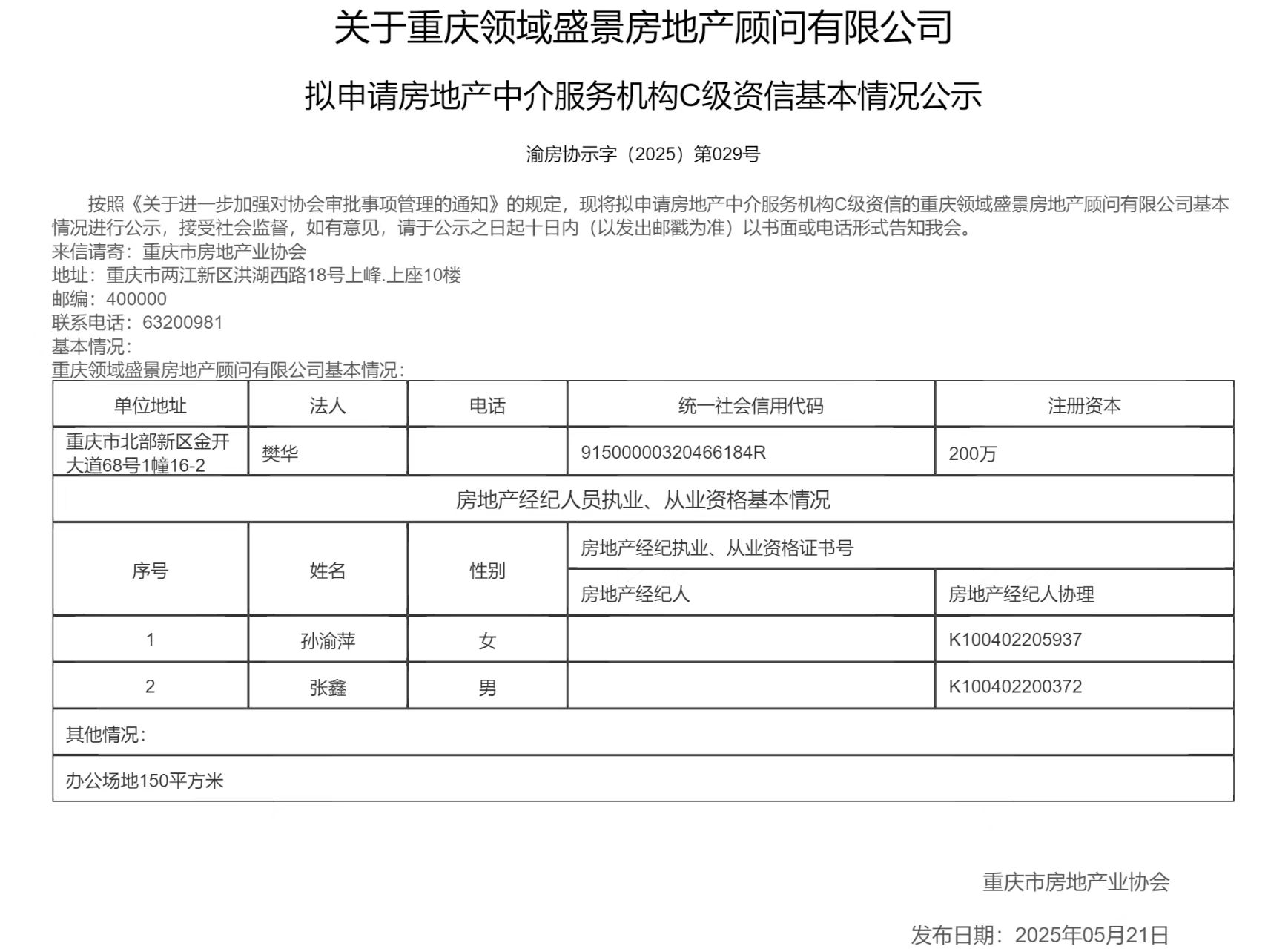首 页 新闻动态 楼盘展示 市场动态 房地产经纪 专题 蔡家智慧新城 保交楼保交房 "两久"项目2025 自媒体自律联盟 名企及优质楼盘联展 休闲地产 美好家园 美好天赋 复工复产 "两久"项目2024 "白名单"项目融资 通知 资专委/商专委 登记/测绘投诉 协会专区 “金九银十”如期而至,9月重庆中心城区新建商品住房成交环比增长超3成 涉及保交房、租房、“人房地钱”……住建部副部长董建国重磅阐释 “中秋团圆·爱在我家”品质楼盘促销活动圆满结束 中秋品质楼盘促销活动持续火爆 线下展会仅剩最后一天! 您的当前位置 : 主页 > 房地产经纪 > 关于重庆领域盛景房地产顾问有限公司拟申请房地产中介服务机构C级资信基本情况公示 2025-05-26 15:21 来源:全媒体中心 返回 友情链接 重庆市政府部门网站 重庆网上房地产
